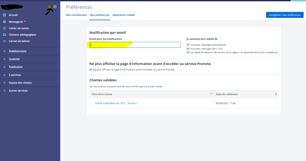 Vous pouvez enregistrer votre email personnel pour recevoir une notification de l’ENT pour vous prévenir que vous avez un message.